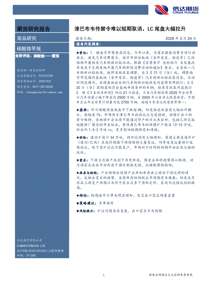 信达期货-碳酸锂早报:津巴布韦传禁令难以短期取消,LC尾盘大幅拉升-260324