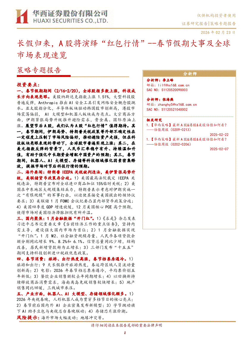 华西证券-策略专题报告:长假归来,A股将演绎“红包行情”——春节假期大事及全球市场表现速览-260223