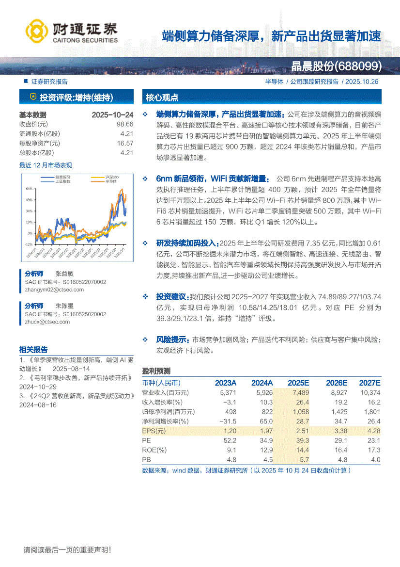 晶晨股份:财通证券-晶晨股份-688099-端侧算力储备深厚,新产品出货显著加速-251026