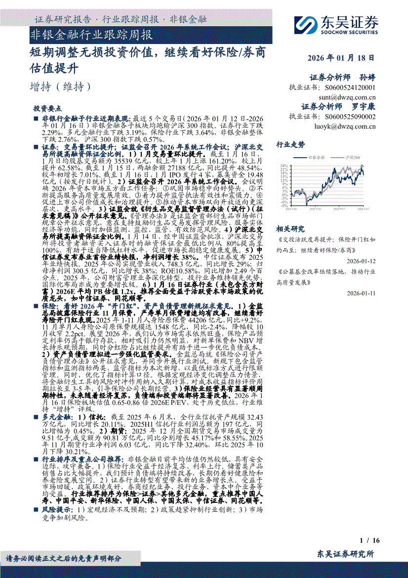 非银金融行业:东吴证券-非银金融行业跟踪周报:短期调整无损投资价值,继续看好保险/券商估值提升-260118