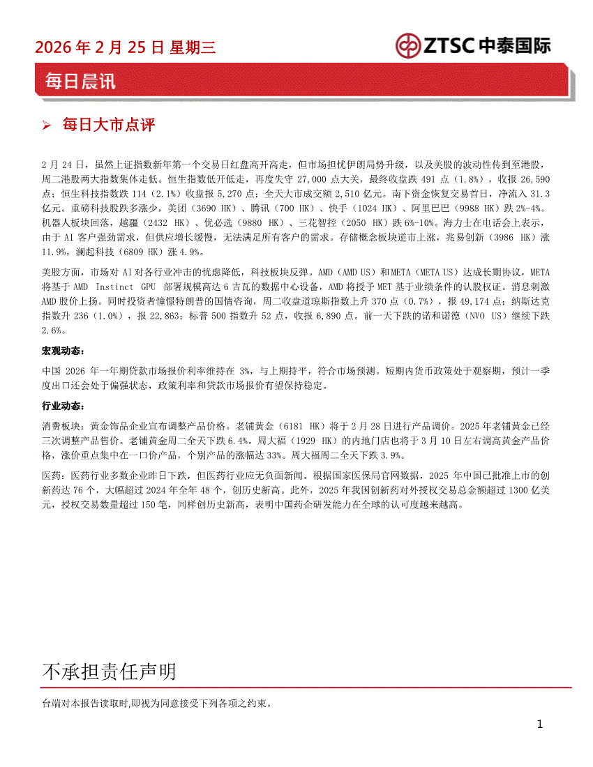 中泰国际-每日晨讯-260225