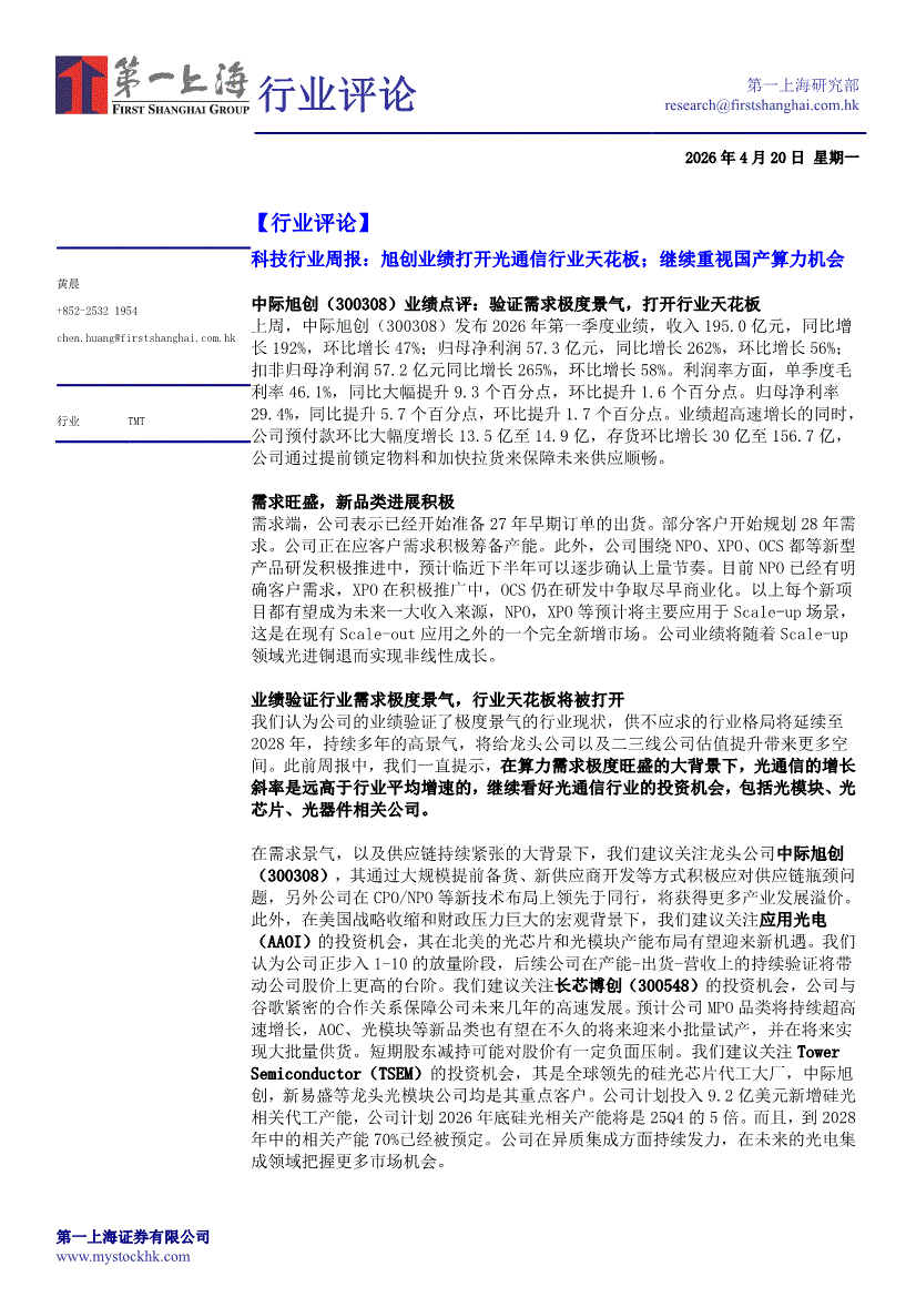 科技行业:第一上海-科技行业周报:旭创业绩打开光通信行业天花板;继续重视国产算力机会-260420