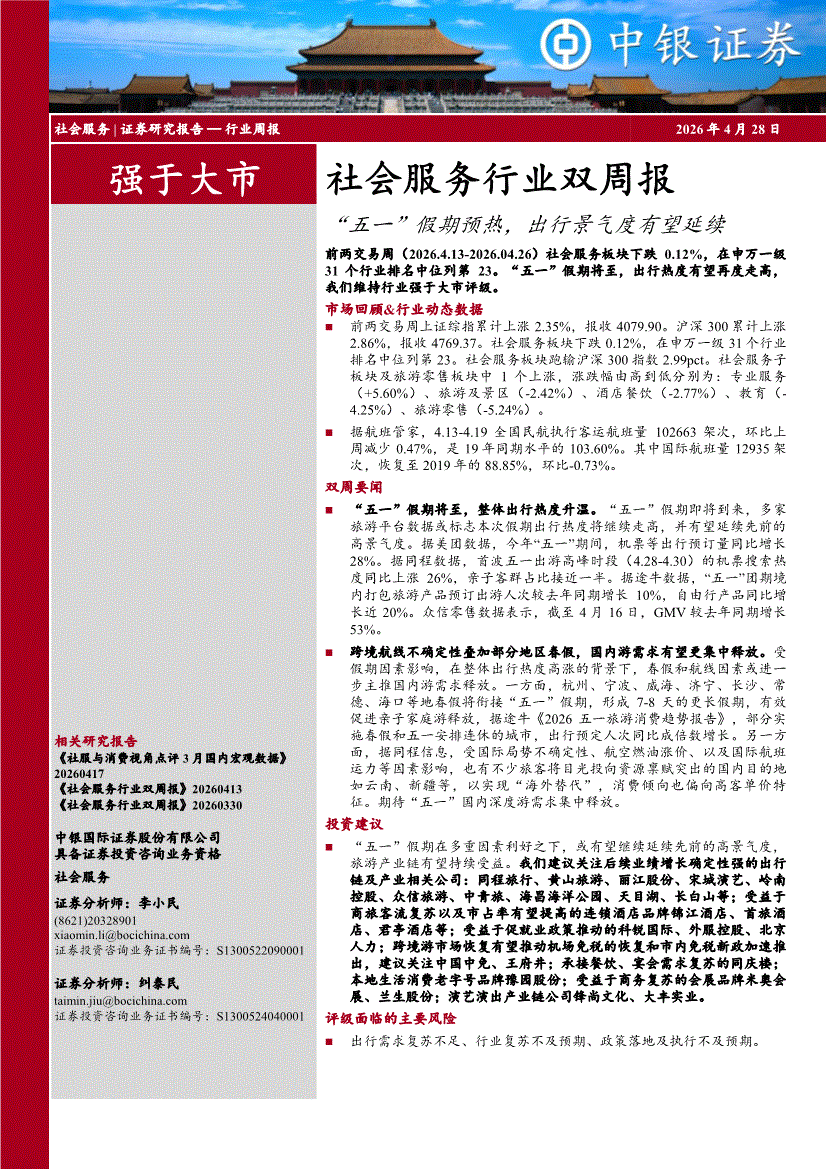 社会服务行业:中银国际-社会服务行业双周报:“五一”假期预热,出行景气度有望延续-260428