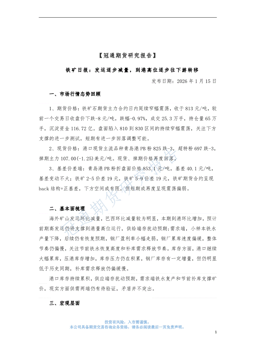 冠通期货-铁矿日报:发运逐步减量,到港高位逐步往下游转移-260115
