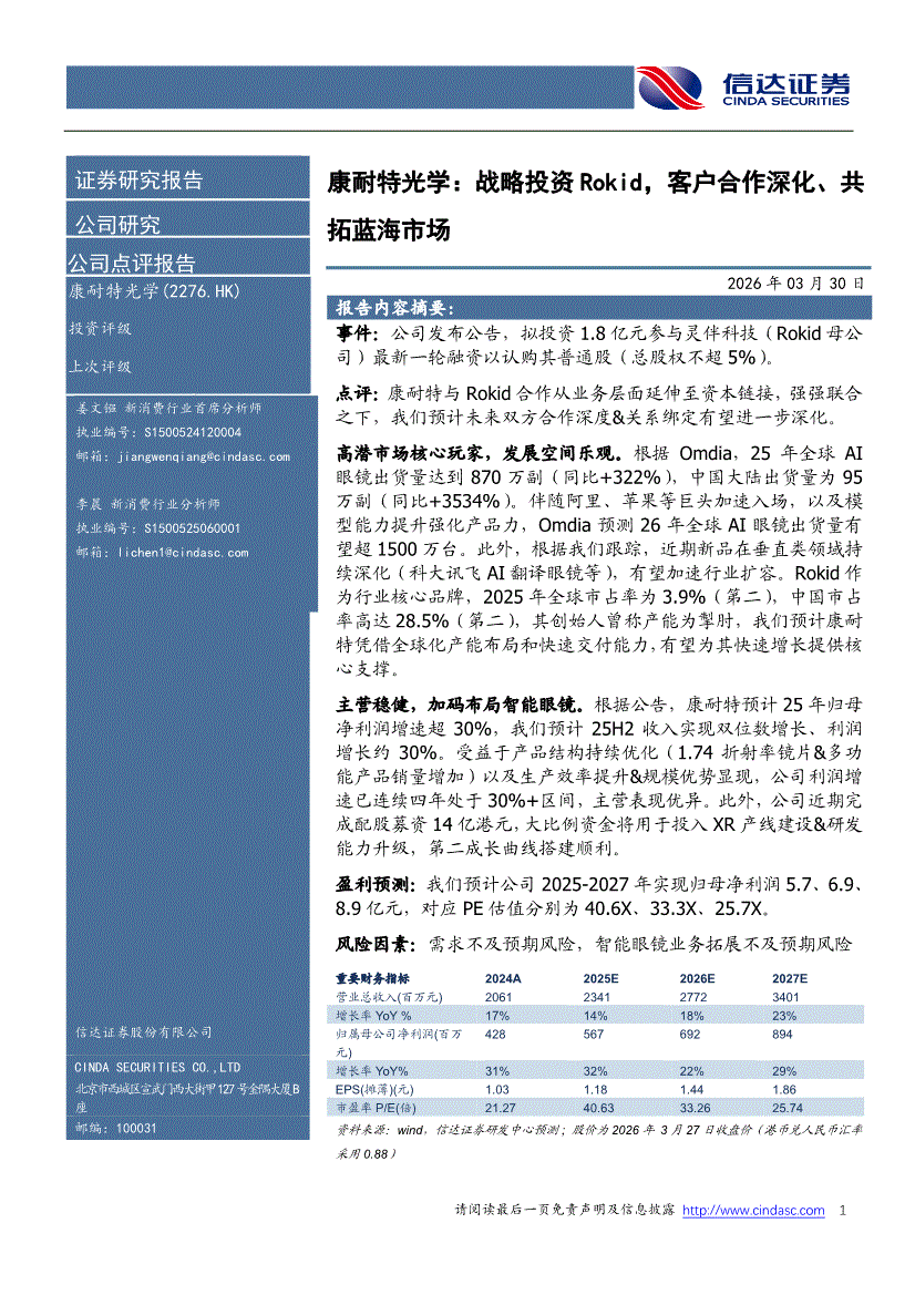 康耐特光学:信达证券-康耐特光学-2276.HK-战略投资Rokid,客户合作深化、共拓蓝海市场-260330