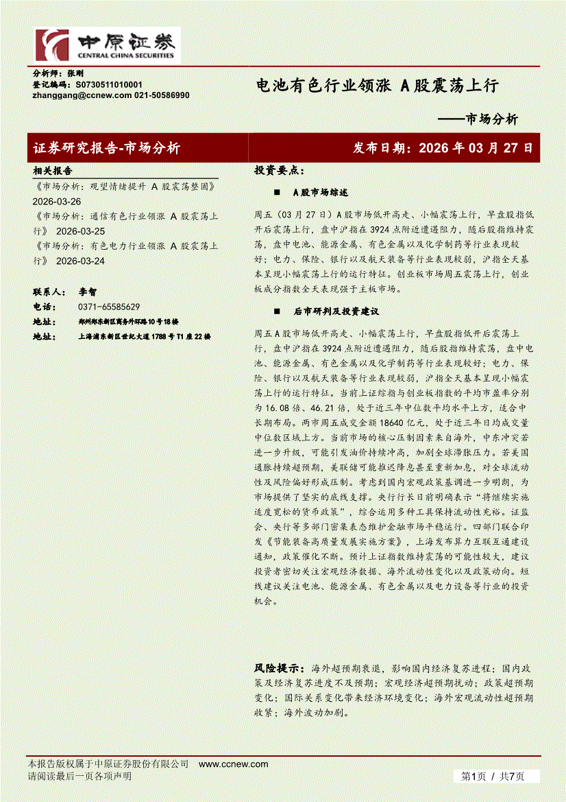 中原证券-市场分析:电池有色行业领涨,A股震荡上行-260327