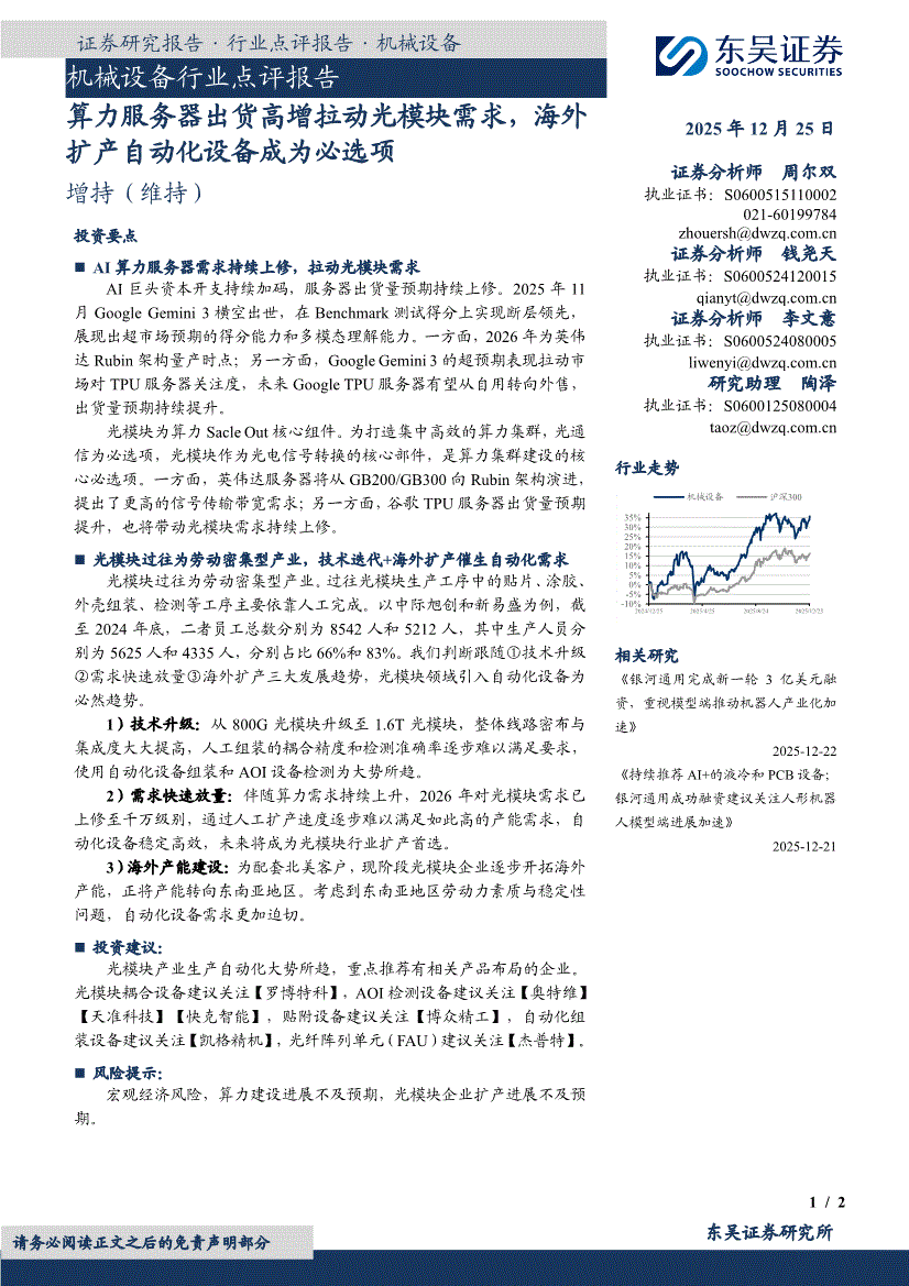 机械设备行业:东吴证券-机械设备行业点评报告:算力服务器出货高增拉动光模块需求,海外扩产自动化设备成为必选项-251225
