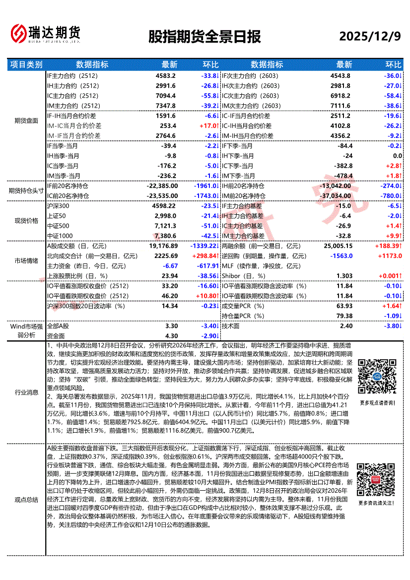 瑞达期货-股指期货全景日报-251209