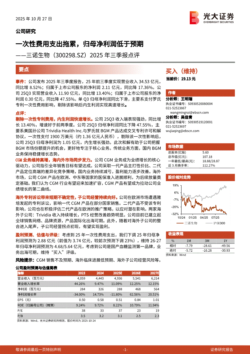 三诺生物:光大证券-三诺生物-300298-2025年三季报点评:一次性费用支出拖累,归母净利润低于预期-251027