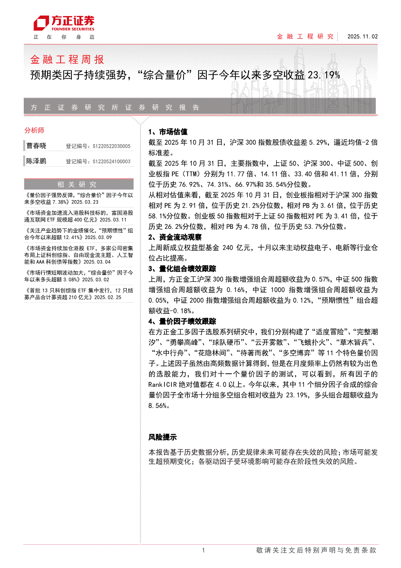 方正证券-金融工程周报:预期类因子持续强势,“综合量价”因子今年以来多空收益23.19%-251102