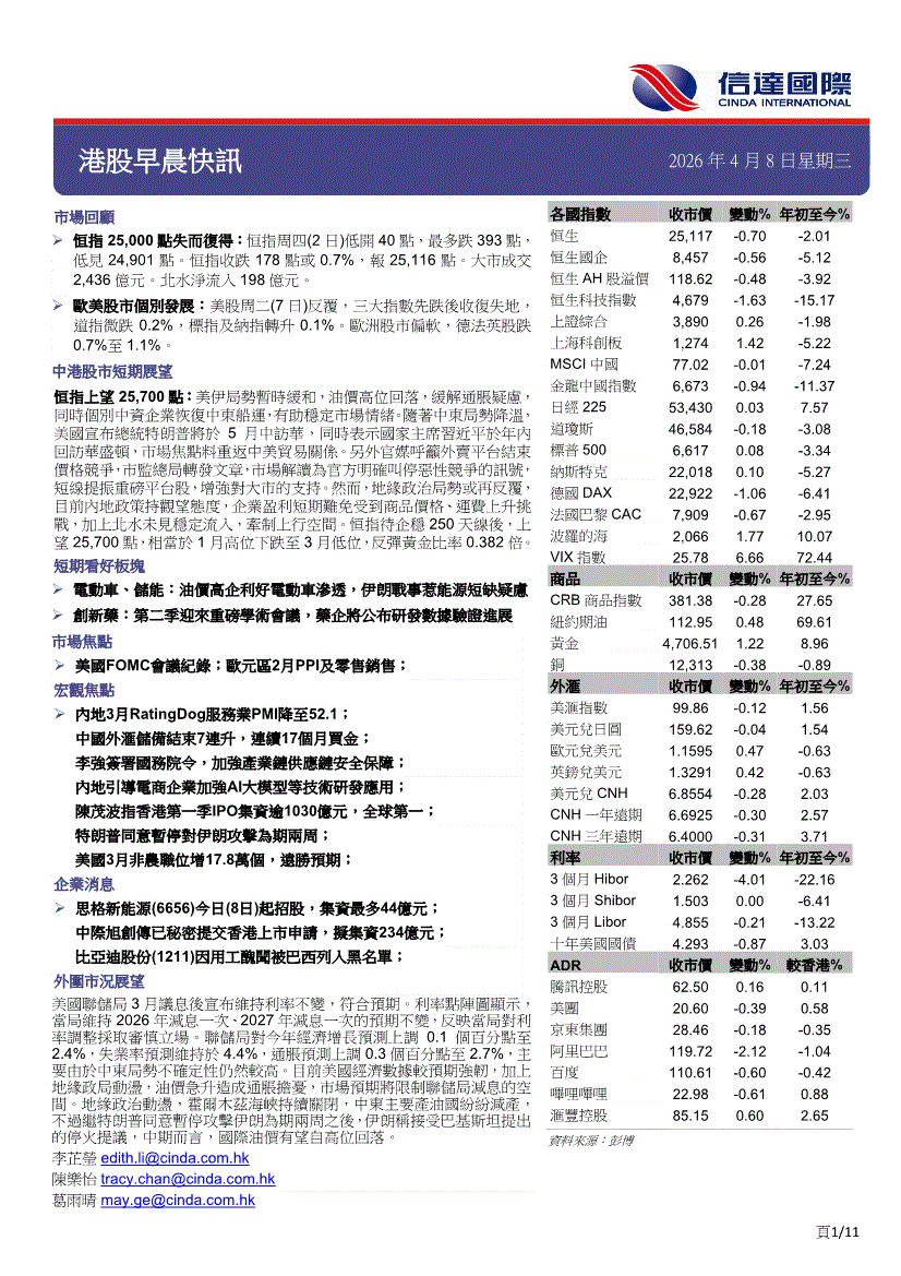 信达国际-港股早晨快讯-260408