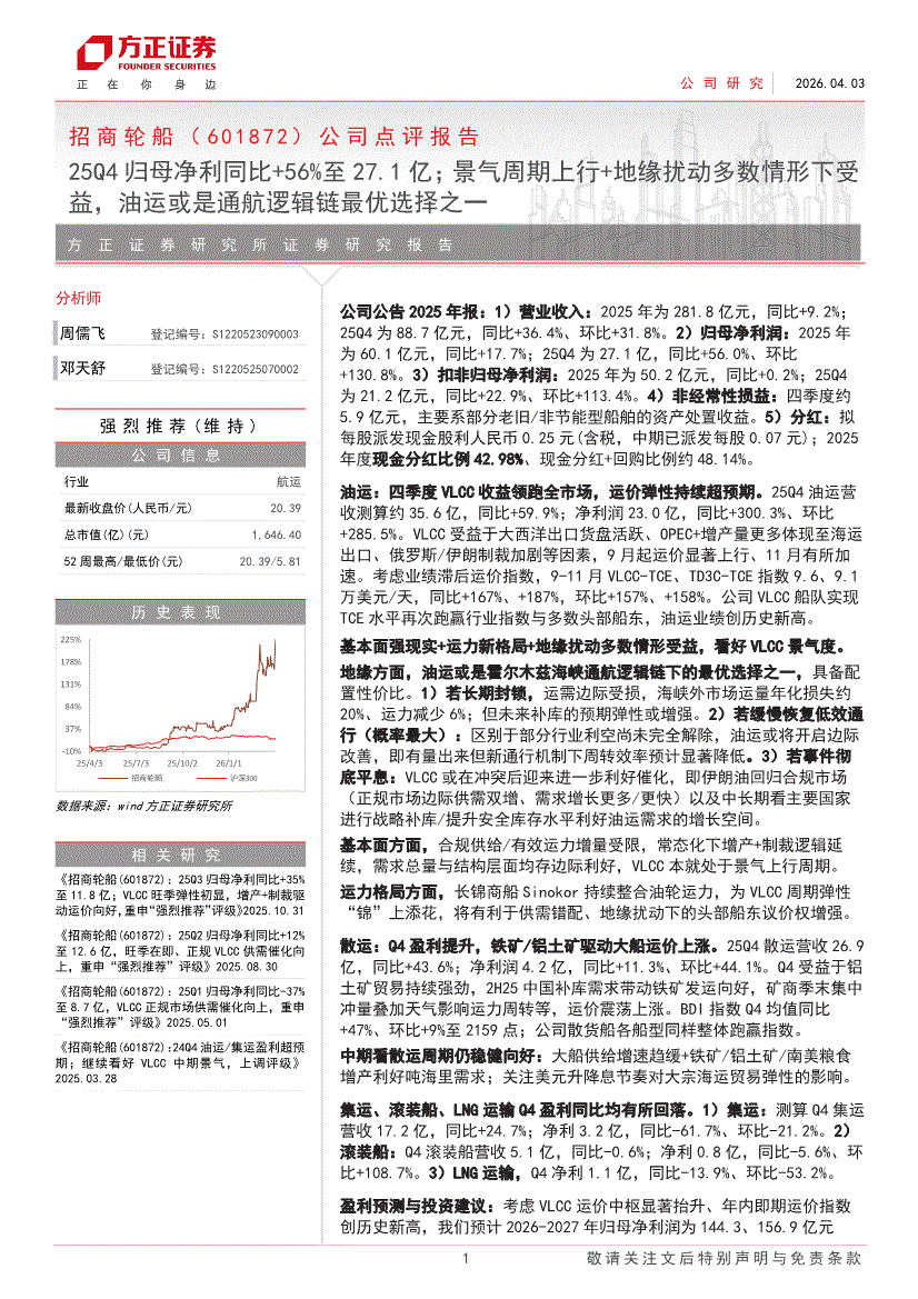 招商轮船:方正证券-招商轮船-601872-公司点评报告:25Q4归母净利同比+56%至27.1亿;景气周期上行+地缘扰动多数情形下受益,油运或是通航逻辑链最优选择之一-260403