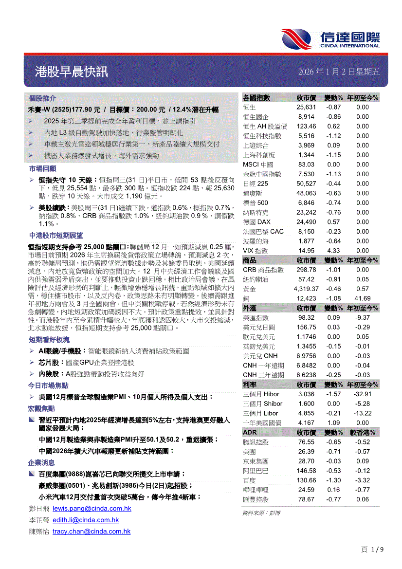 信达国际-港股早晨快讯-251231