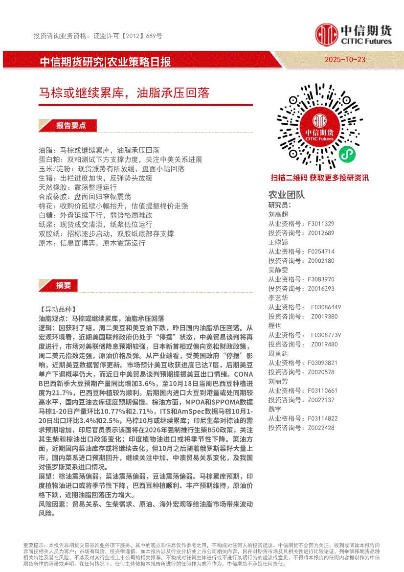 中信期货-农业策略日报:马棕或继续累库,油脂承压回落-251023
