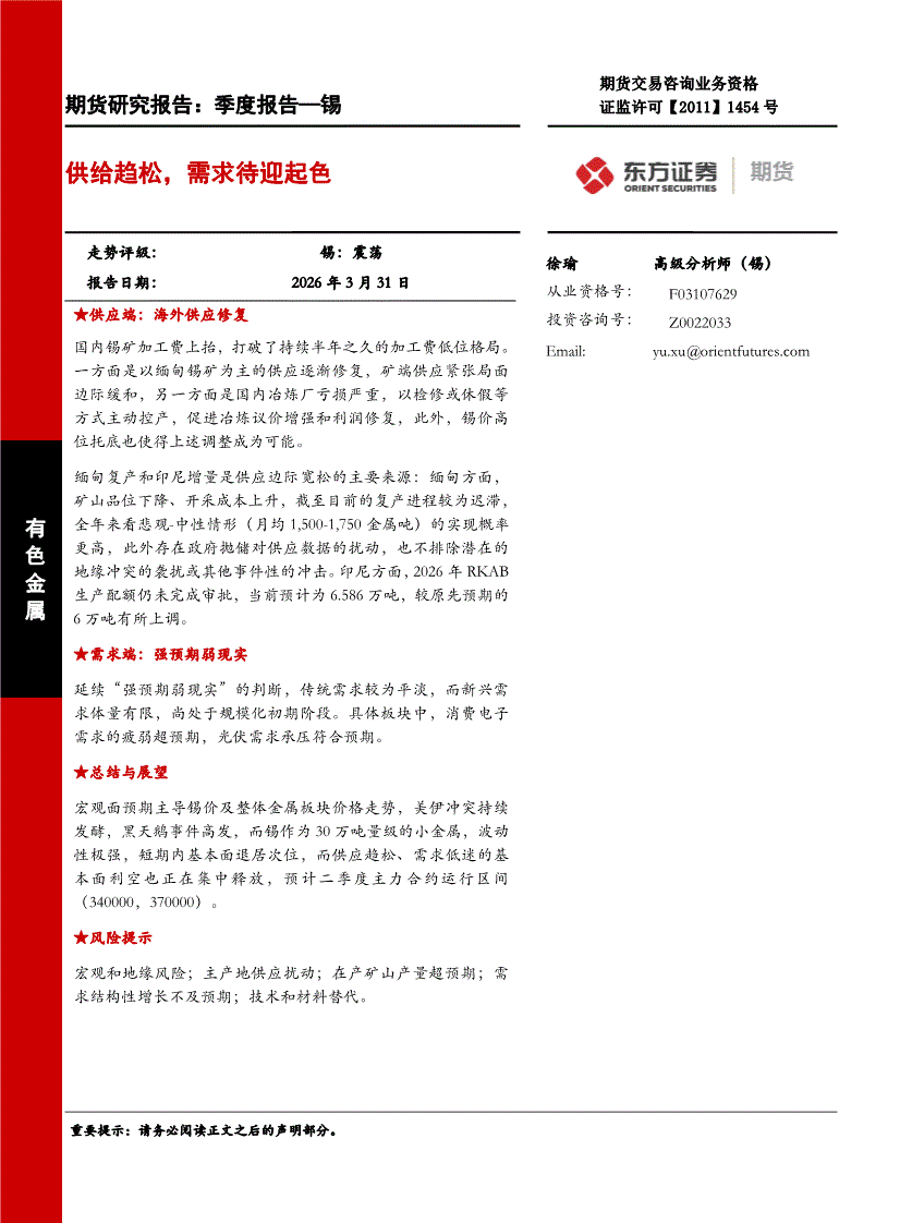 东证期货-锡季度报告:供给趋松,需求待迎起色-260331