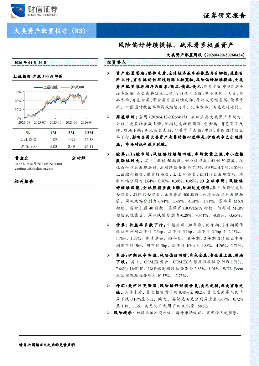 财信证券-大类资产配置周报:风险偏好持续提振,战术看多权益资产-260420