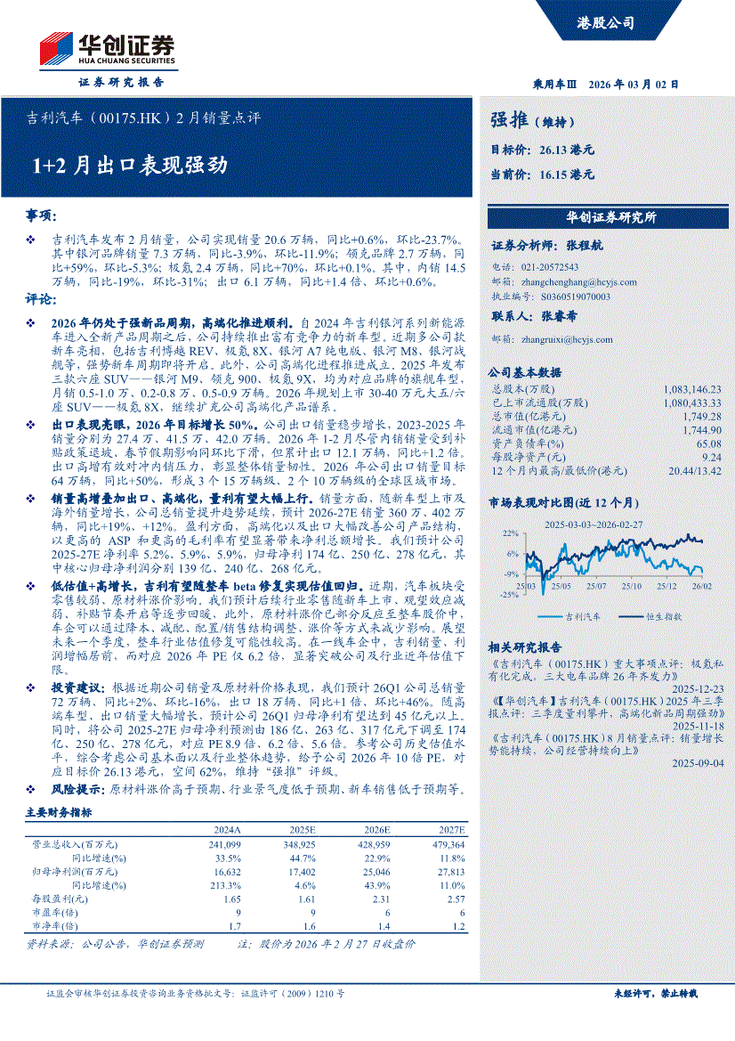 吉利汽车:华创证券-吉利汽车-0175.HK-2月销量点评:1+2月出口表现强劲-260302