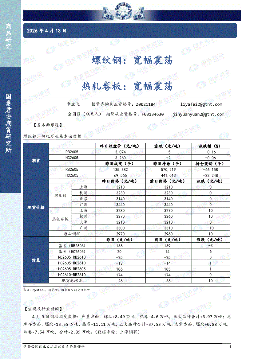 国泰君安期货-螺纹钢:宽幅震荡,热轧卷板,宽幅震荡-260413