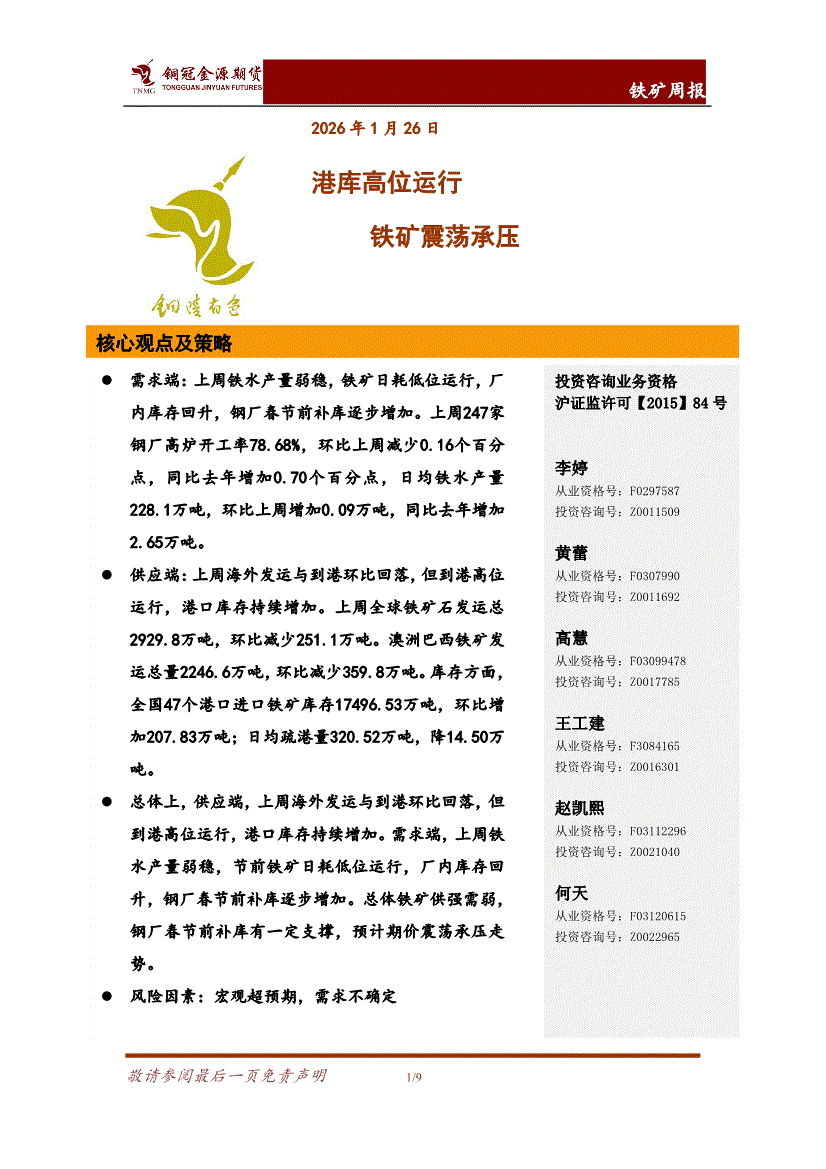 铜冠金源期货-铁矿周报:港库高位运行,铁矿震荡承压-260126
