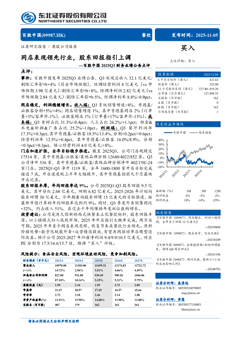 百胜中国:东北证券-百胜中国-9987.HK-2025Q3财务业绩公告点评:同店表现领先行业,股东回报指引上调-251105