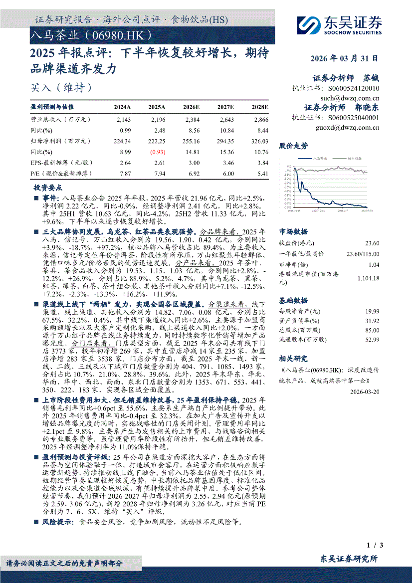 八马茶业:东吴证券-八马茶业-6980.HK-2025年报点评:下半年恢复较好增长,期待品牌渠道齐发力-260331