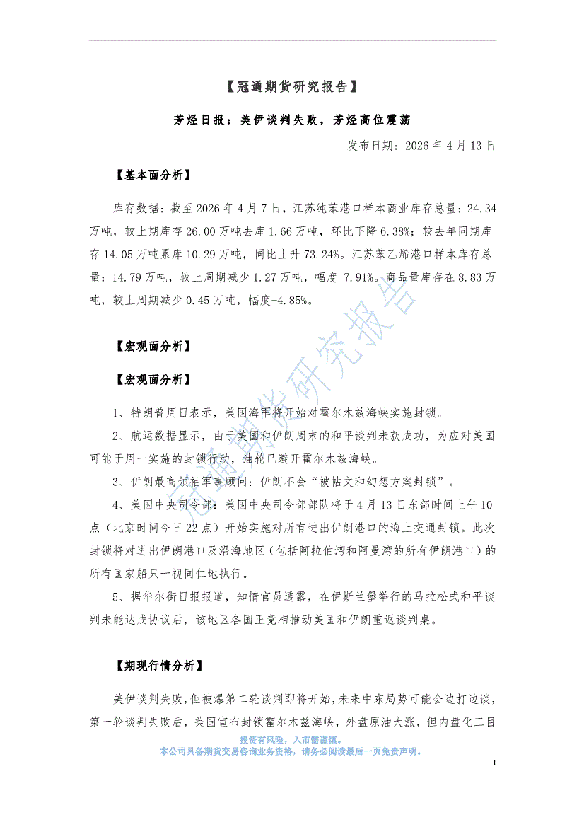 冠通期货-芳烃日报:美伊谈判失败,芳烃高位震荡-260413