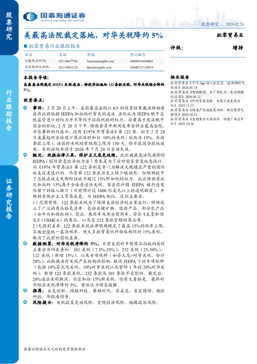 批零贸易行业:国泰海通证券-批零贸易行业跟踪报告:美最高法院裁定落地,对华关税降约5%-260224