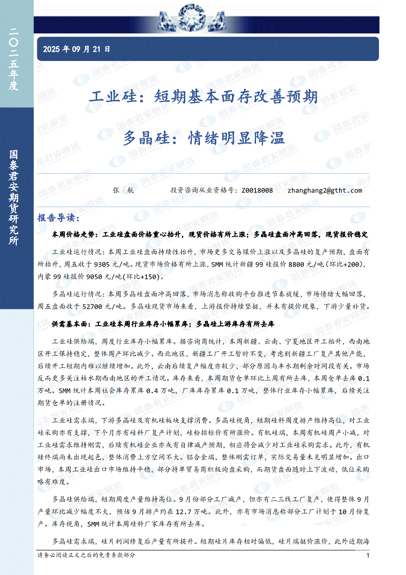 国泰君安期货-工业硅:短期基本面预期有所改善,多晶硅,短期市场情绪有所降温-250922