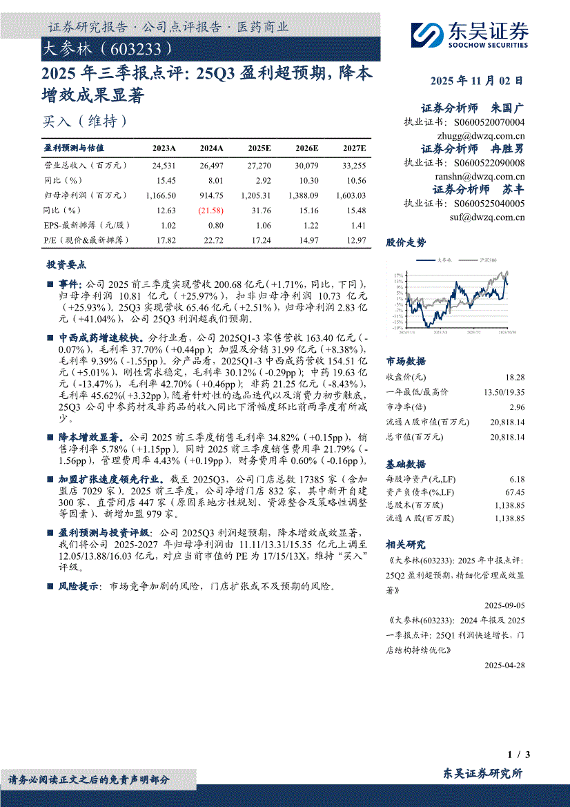 大参林:东吴证券-大参林-603233-2025年三季报点评:25Q3盈利超预期,降本增效成果显著-251102