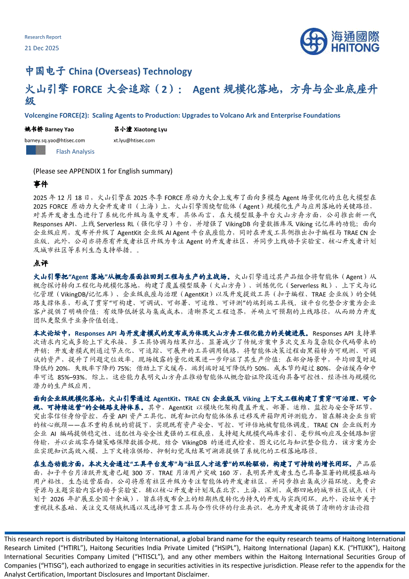 电子行业:海通国际-中国电子行业火山引擎FORCE大会追踪(2):Agent规模化落地,方舟与企业底座升级-251221