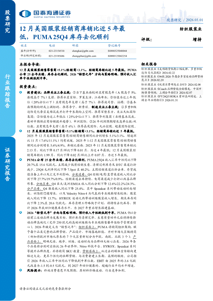 纺织服装行业:国泰海通证券-纺织服装行业:12月美国服装经销商库销比近5年最低,PUMA 25Q4库存去化顺利-260301