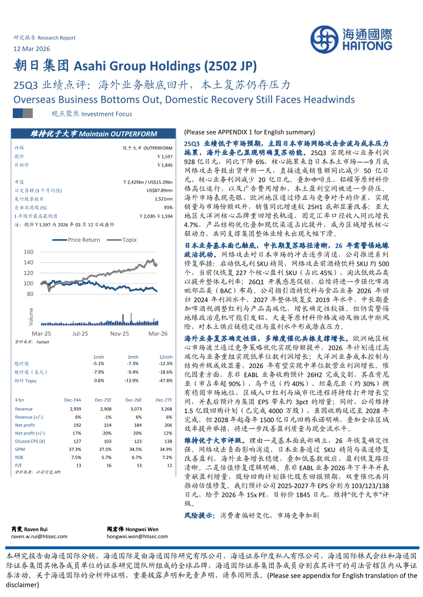 朝日集团:海通国际-朝日集团-2502.JP-25Q3业绩点评:海外业务触底回升,本土复苏仍存压力-260312