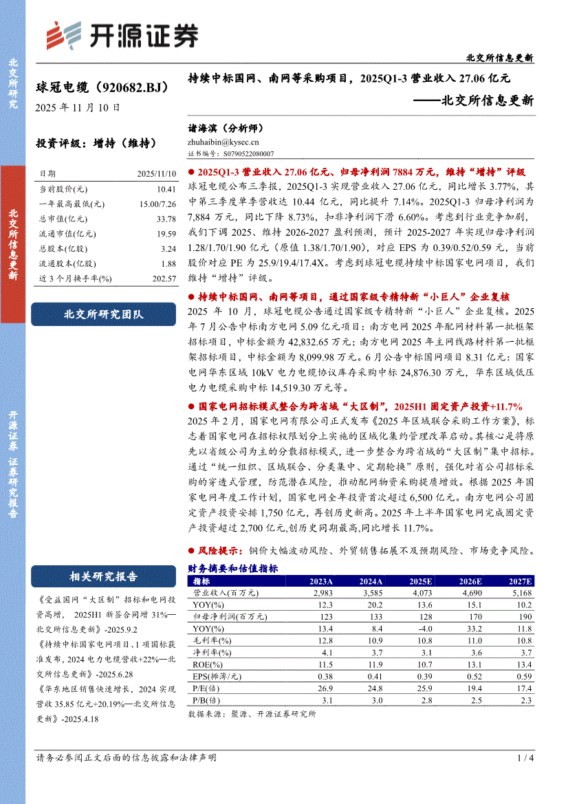 球冠电缆:开源证券-球冠电缆-920682-北交所信息更新:持续中标国网、南网等采购项目,2025Q1~3营业收入27.06亿元-251110