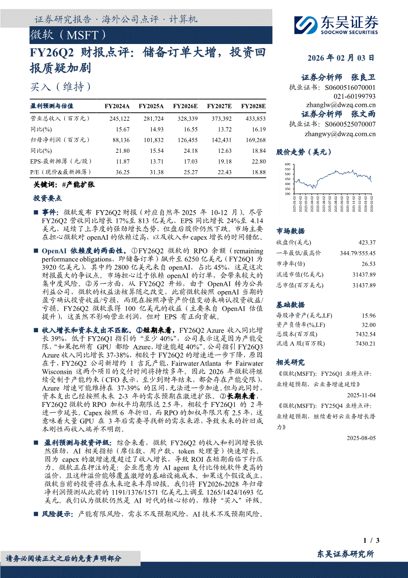 微软:东吴证券-微软-MSFT.US-FY26Q2财报点评:储备订单大增,投资回报质疑加剧-260203