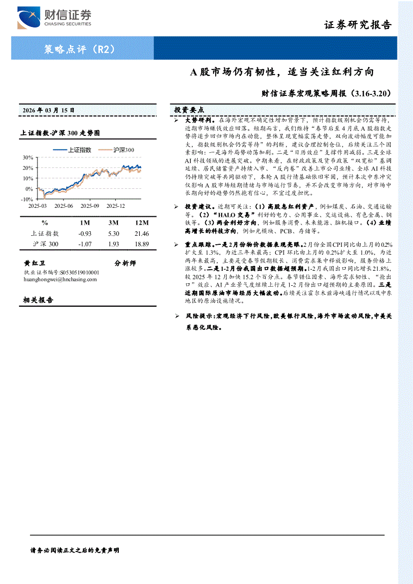 财信证券-宏观策略周报:A股市场仍有韧性,适当关注红利方向-260315