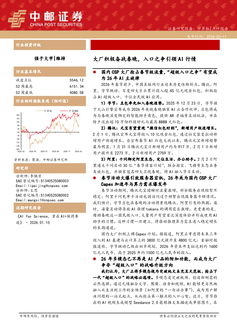 计算机行业:中邮证券-计算机行业:大厂积极备战春晚,入口之争引领AI行情-260211