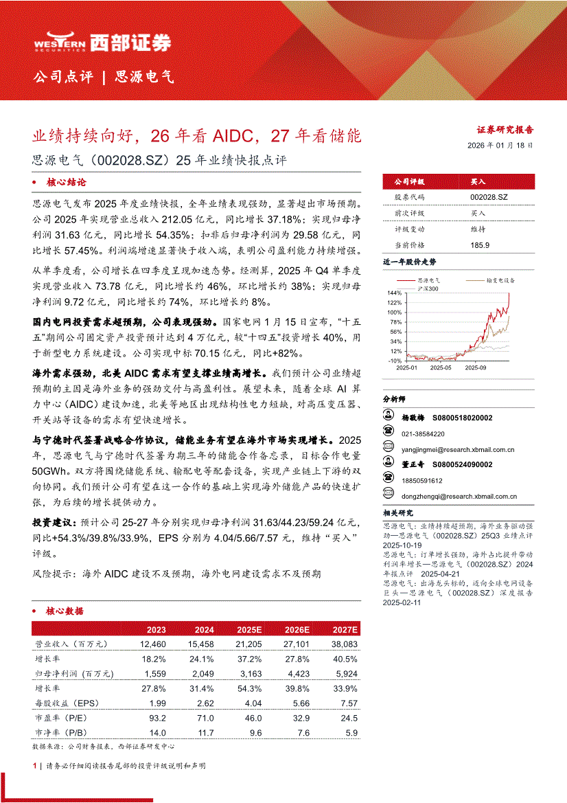 思源电气:西部证券-思源电气-002028-25年业绩快报点评:业绩持续向好,26年看AIDC,27年看储能-260118