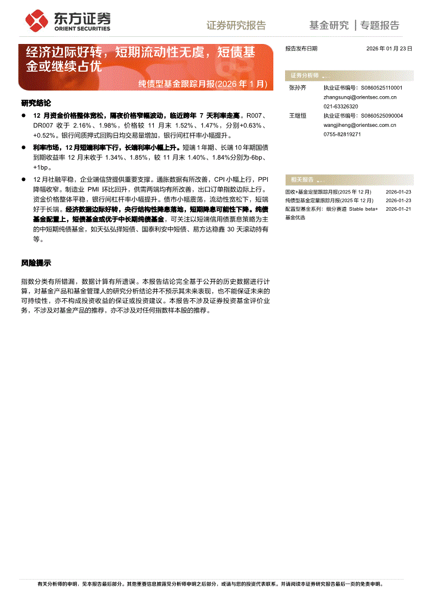 东方证券-纯债型基金跟踪月报(2026年1月):经济边际好转,短期流动性无虞,短债基金或继续占优-260123