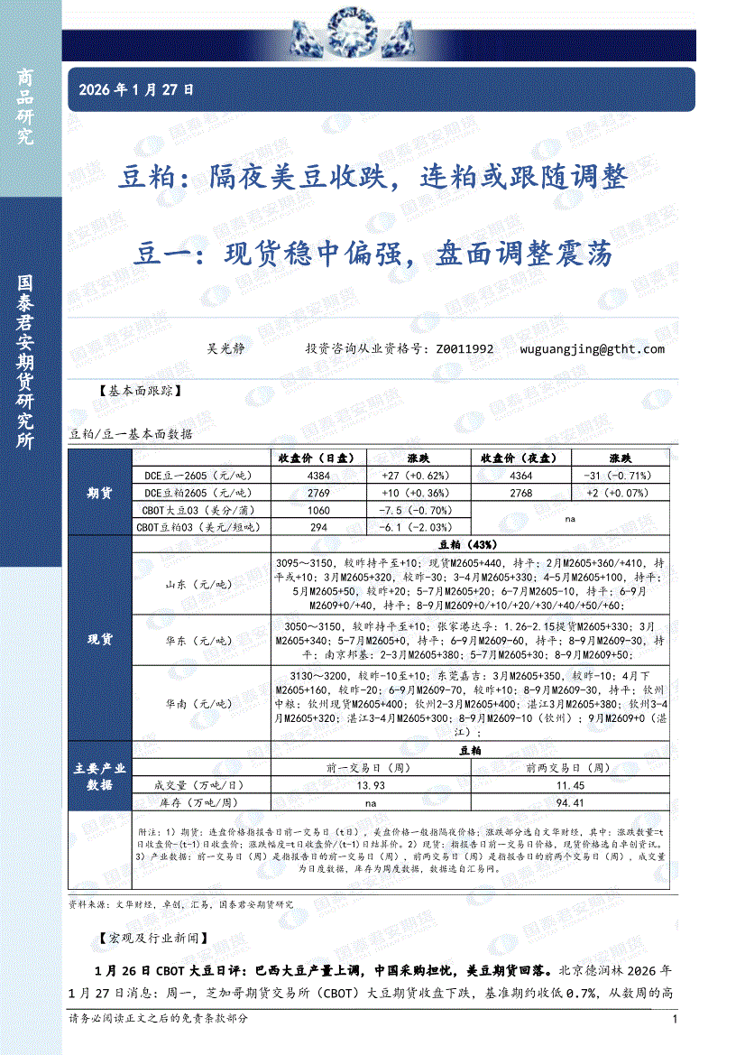 国泰君安期货-豆粕:隔夜美豆收跌,豆粕或跟随调整,豆一,现货稳中偏强,盘面调整震荡-260127