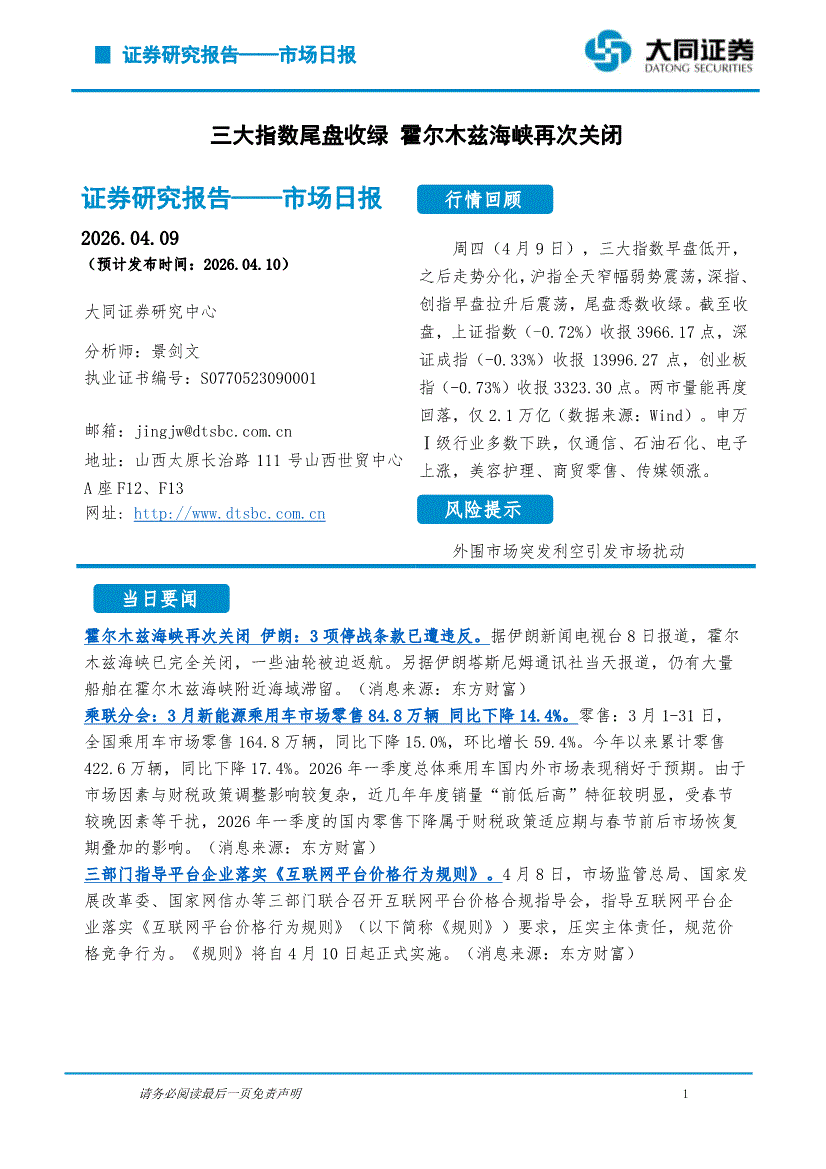 大同证券-市场日报:三大指数尾盘收绿,霍尔木兹海峡再次关闭-260409