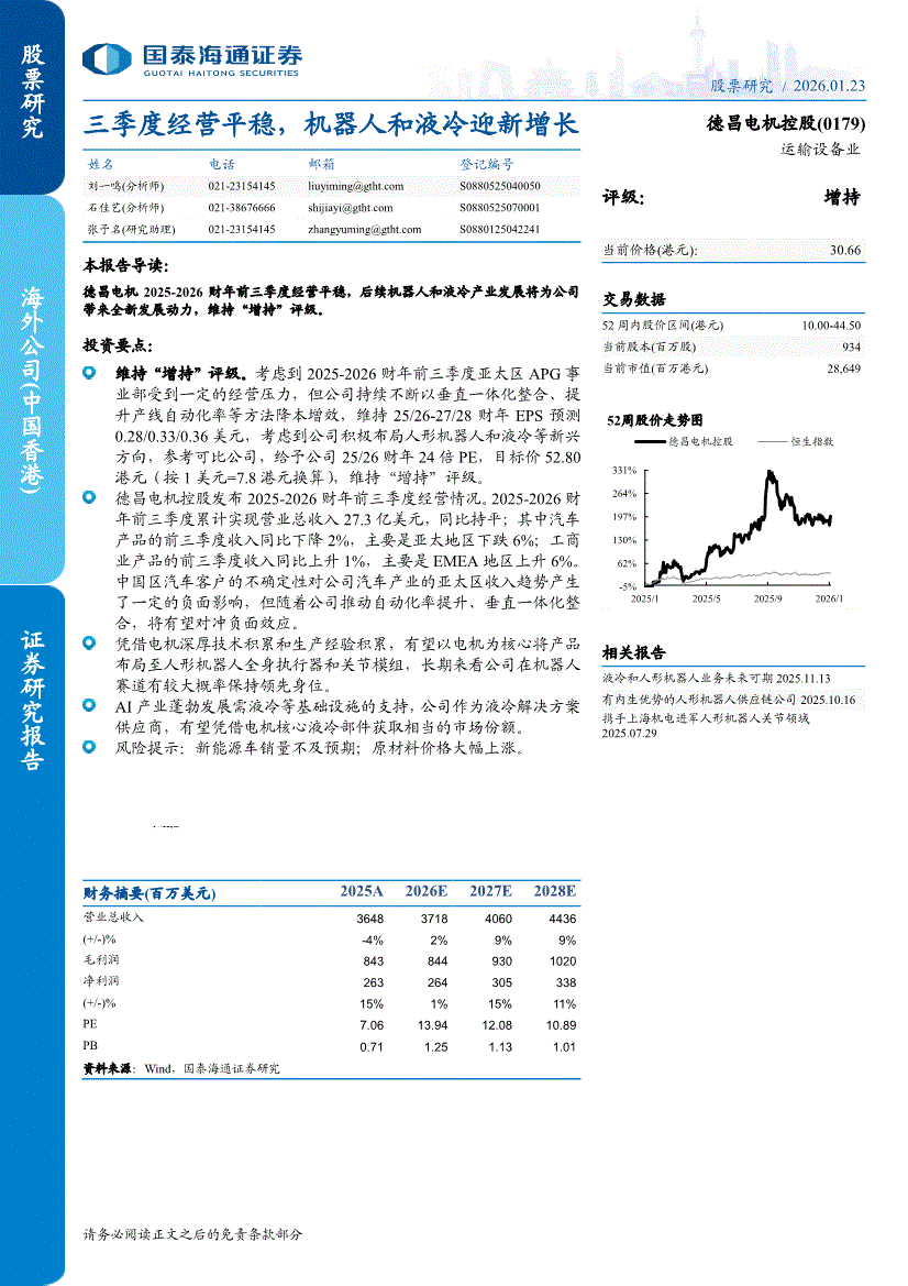 德昌电机控股:国泰海通证券-德昌电机控股-0179.HK-三季度经营平稳,机器人和液冷迎新增长-260123