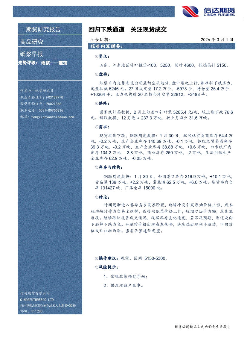 信达期货-纸浆早报:回归下跌通道,关注现货成交-260301