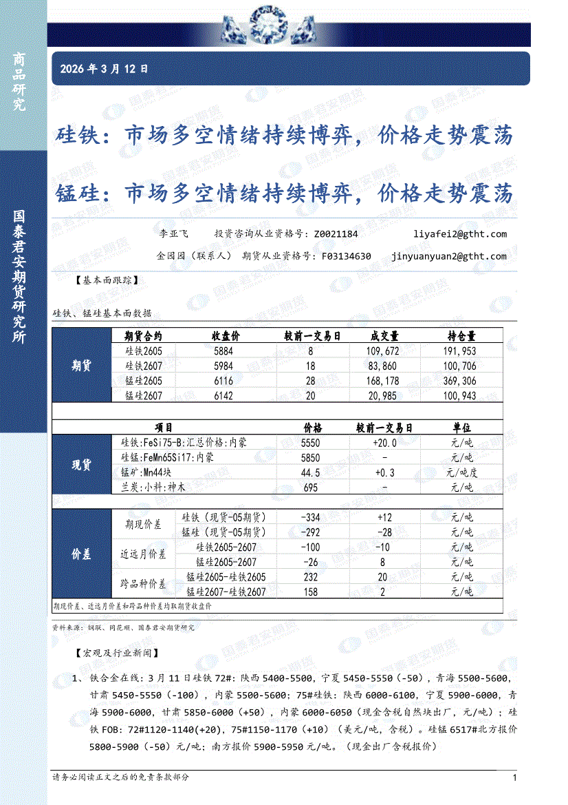 国泰君安期货-硅铁:多空双方博弈,宽幅震荡,锰硅,多空双方博弈,宽幅震荡-260309