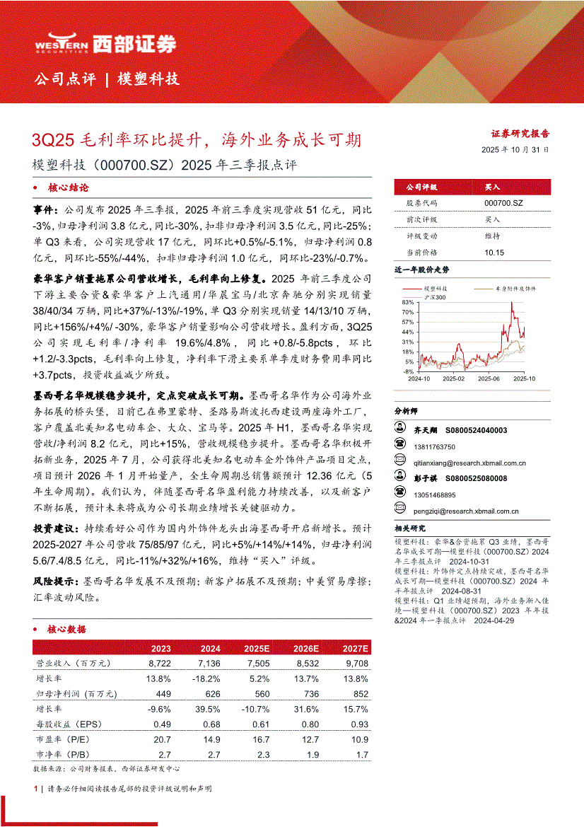 模塑科技:西部证券-模塑科技-000700-2025年三季报点评:3Q25毛利率环比提升,海外业务成长可期-251031