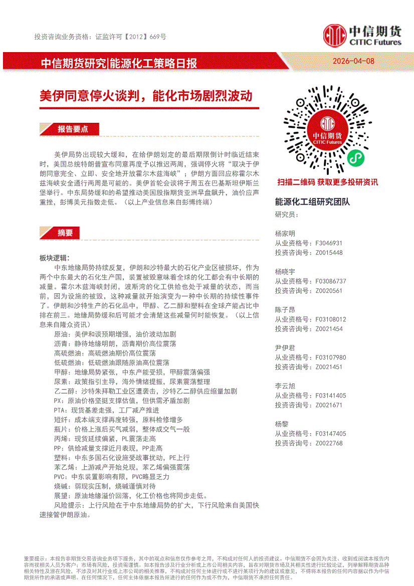 中信期货-能源化工策略日报:美伊同意停火谈判,能化市场剧烈波动-260408