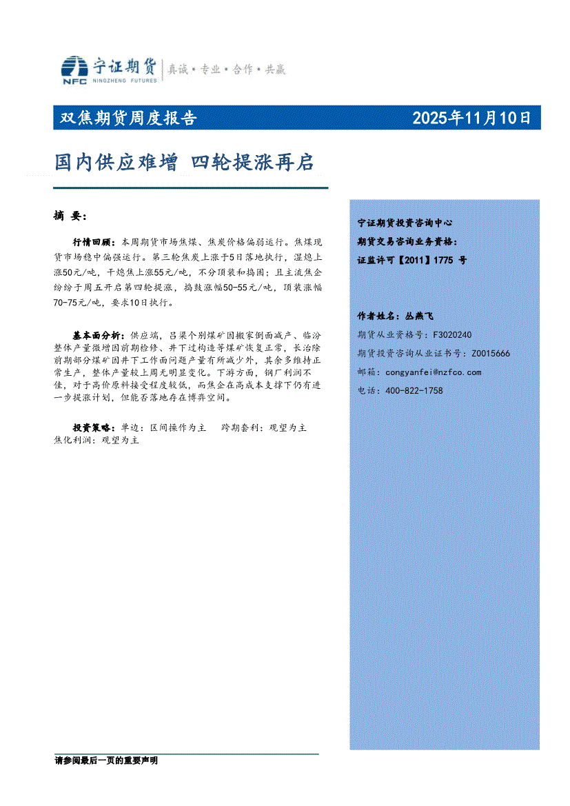 宁证期货-双焦期货周度报告:国内供应难增,四轮提涨再启-251110