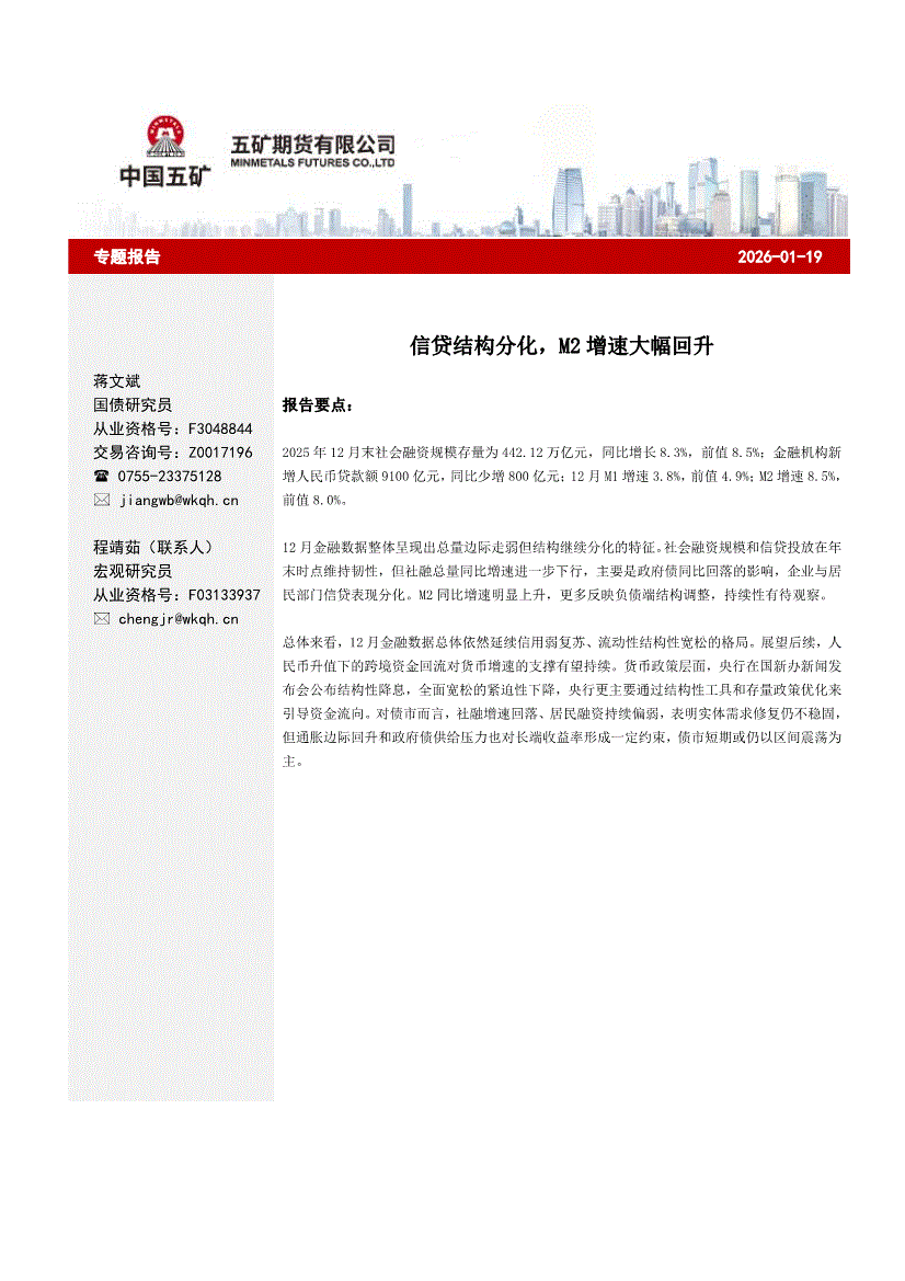 五矿期货-信贷结构分化,M2增速大幅回升-260119