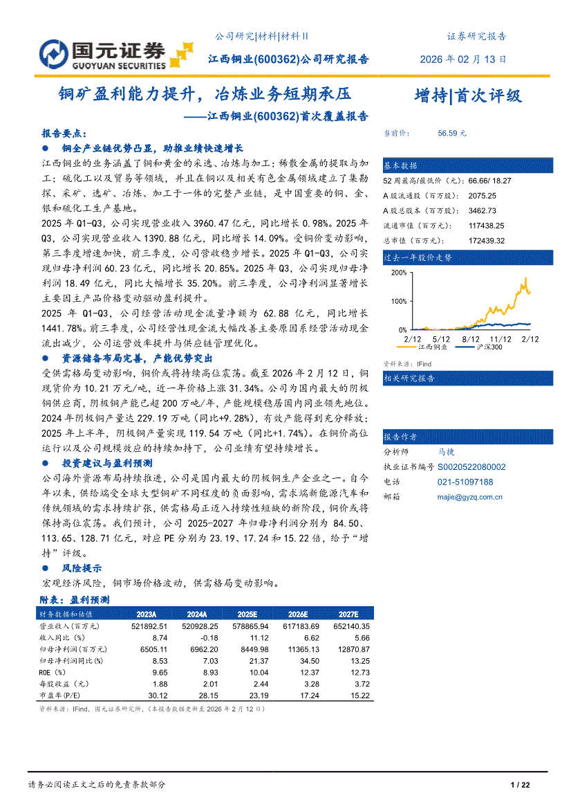江西铜业:国元证券-江西铜业-600362-首次覆盖报告:铜矿盈利能力提升,冶炼业务短期承压-260213