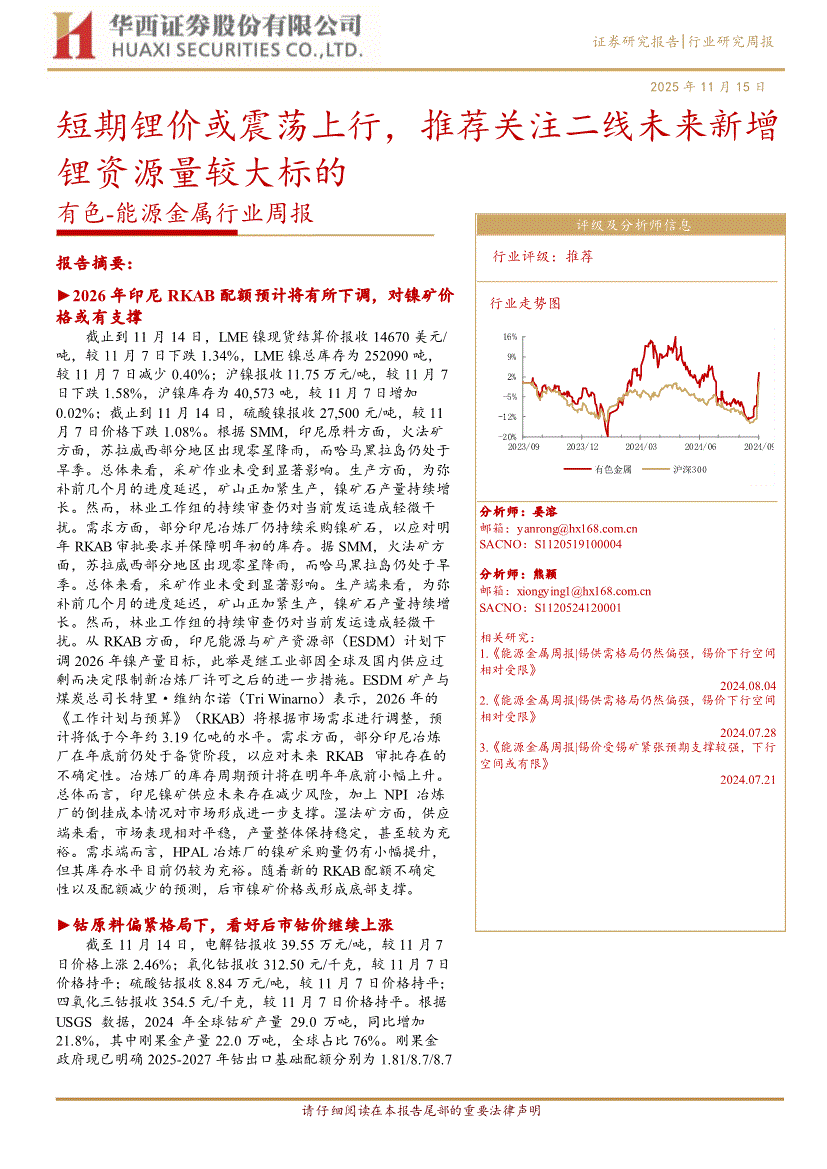 有色~能源金属行业:华西证券-有色~能源金属行业周报:短期锂价或震荡上行,推荐关注二线未来新增锂资源量较大标的-251115