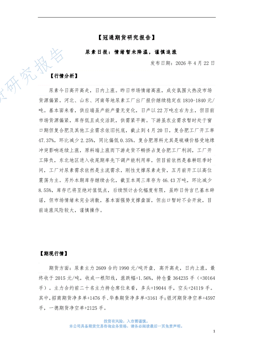 冠通期货-尿素日报:情绪暂未降温,谨慎追涨-260422